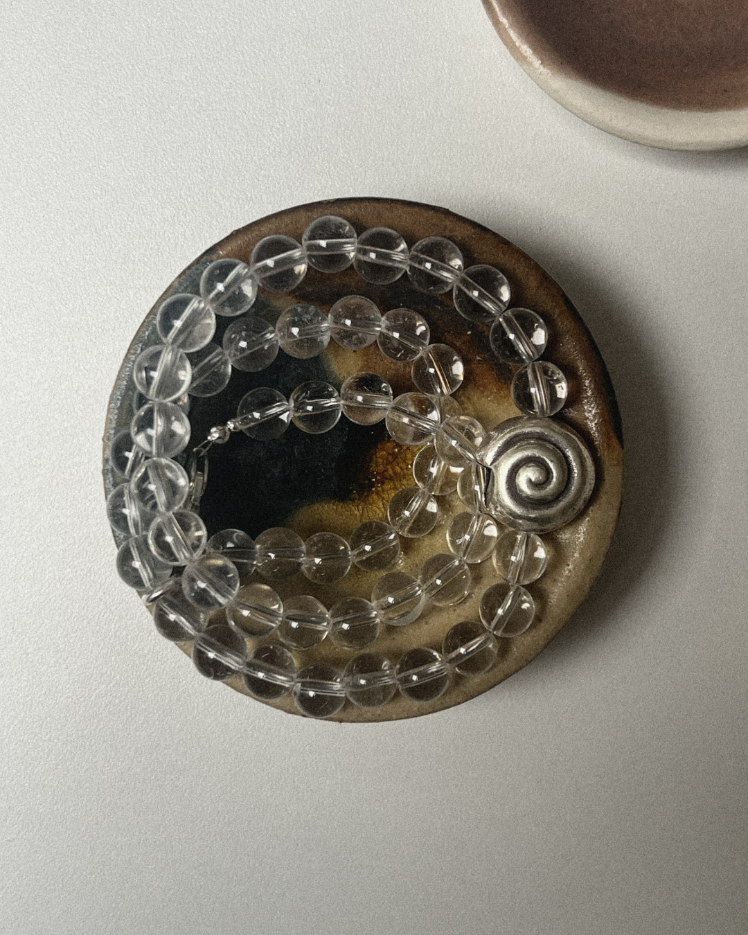 Clear quartz is associated with clarity, focus, and energetic amplification, often used to cleanse and uplift. The silver spiral symbolises rhythm, flow, and quiet transformation, while silver itself brings balance and reflection. Together, they create a piece that feels bright yet steady - luminous, grounding, and quietly transformative.
