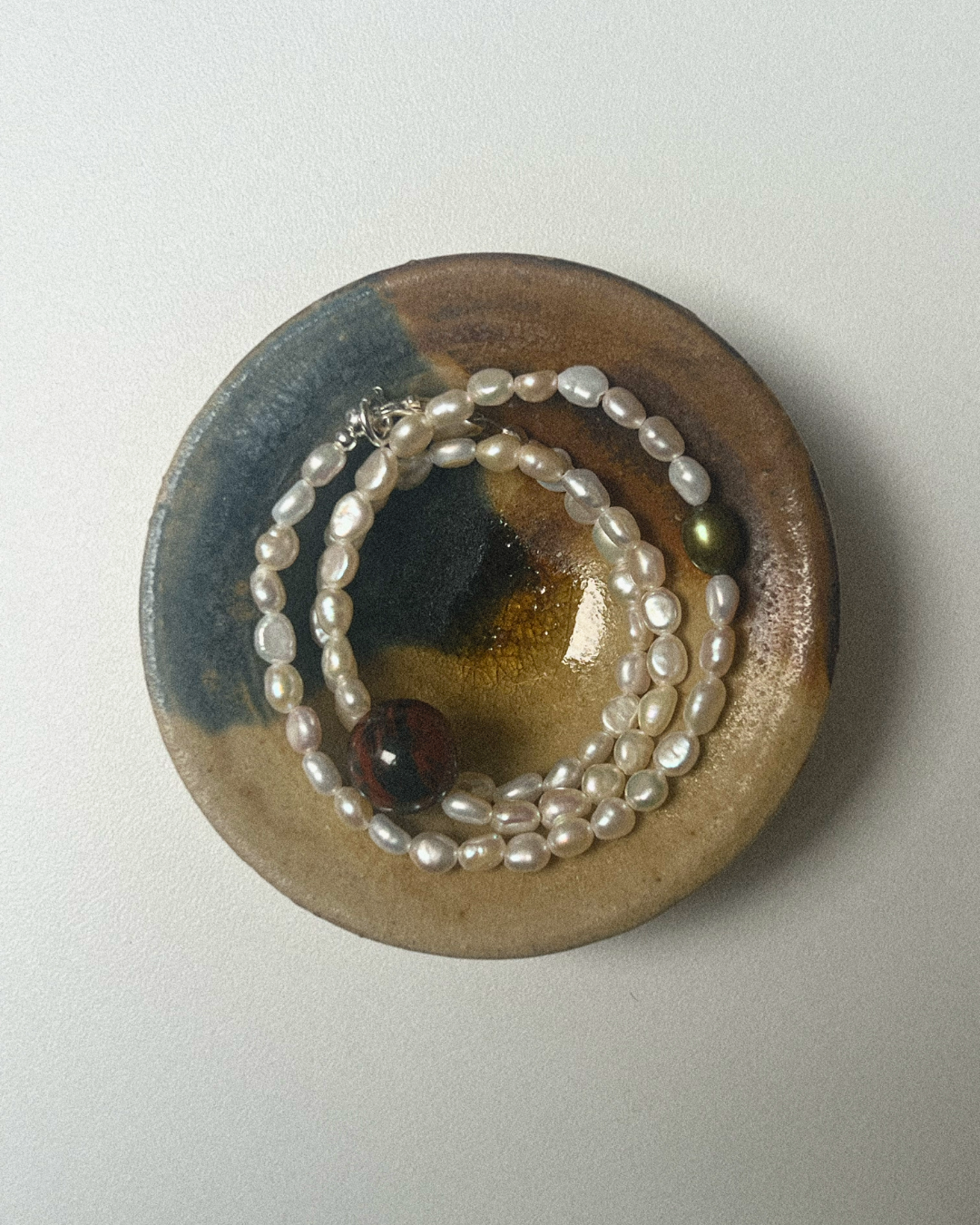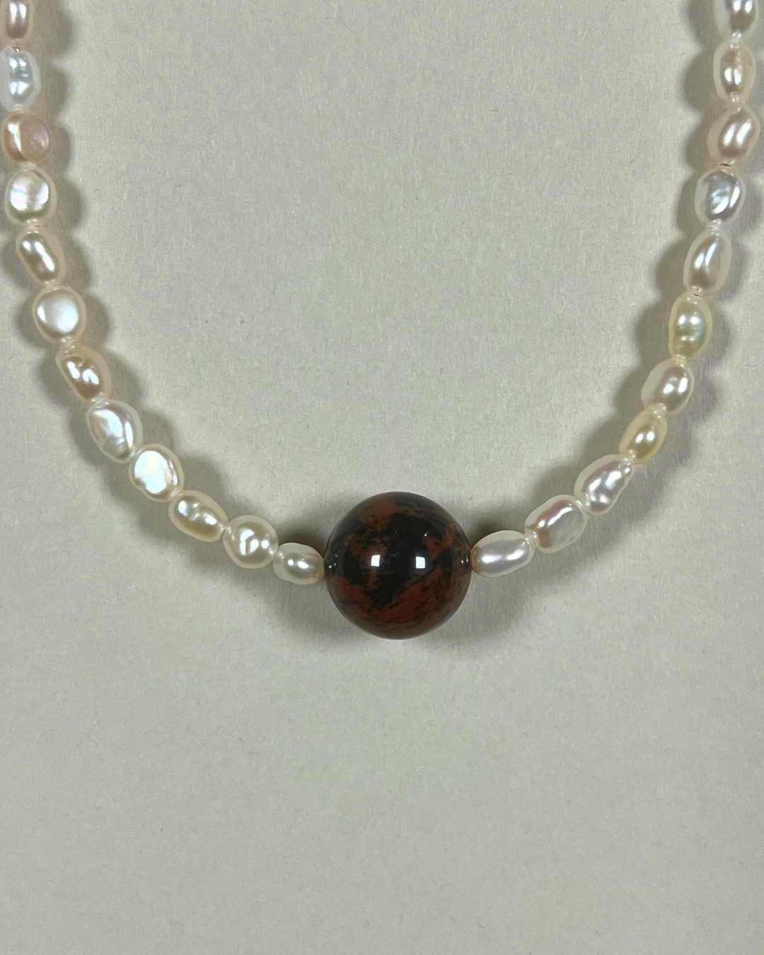 Pearl is associated with calm and reflection, offering emotional balance and softness. Mahogany obsidian is linked to grounding and protection, bringing stability and resilience, while green pearl adds a gentle note of harmony. Together, they create a piece that feels soft yet steady — luminous, grounding, and quietly balanced.