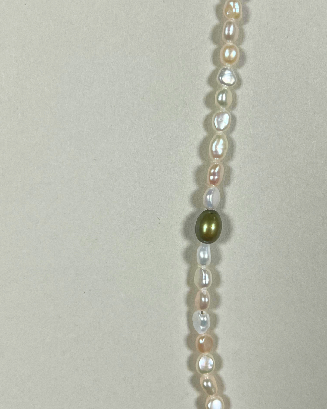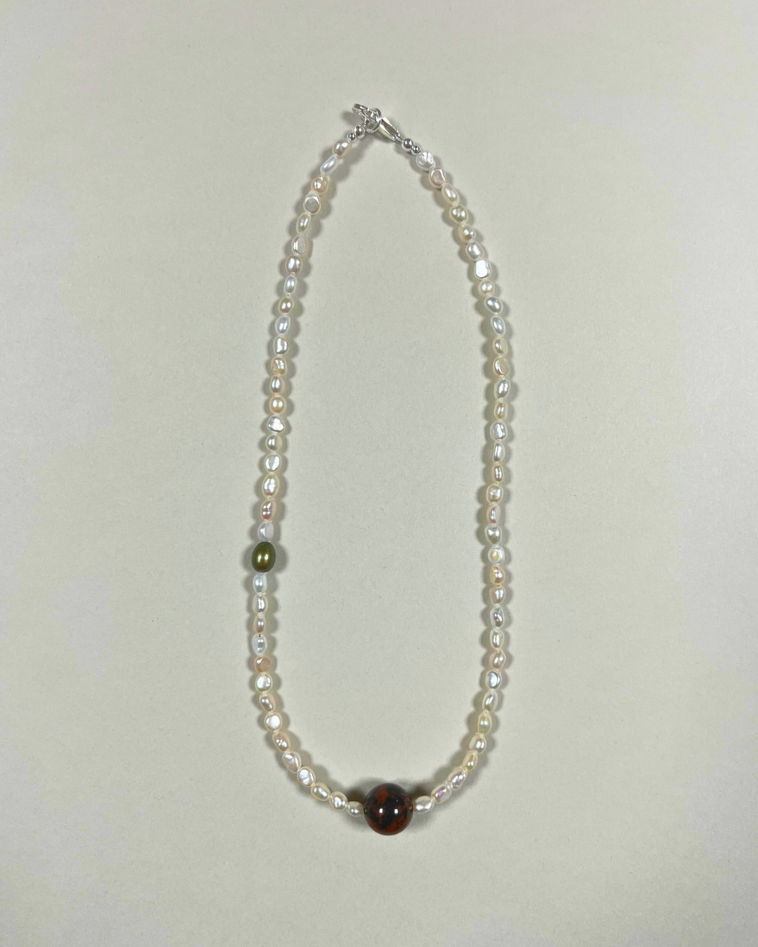 A one-of-a-kind necklace featuring petite freshwater pearls, hand-strung and finished with sterling silver findings and clasp. At its centre sits a round mahogany obsidian bead, accented with a green freshwater pearl for subtle colour and contrast.