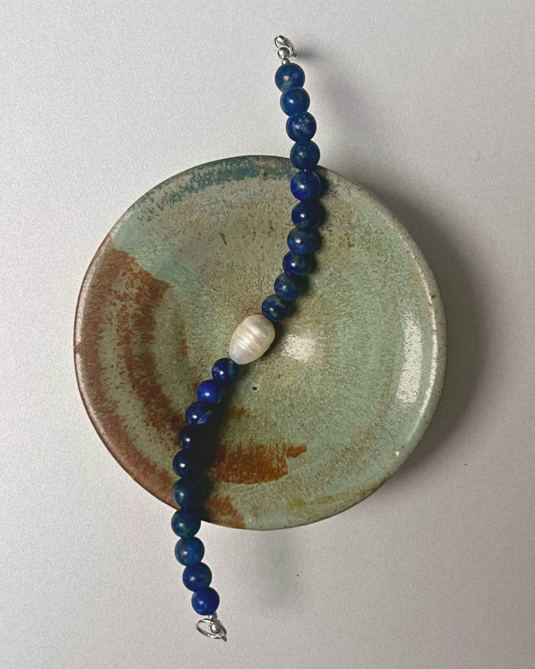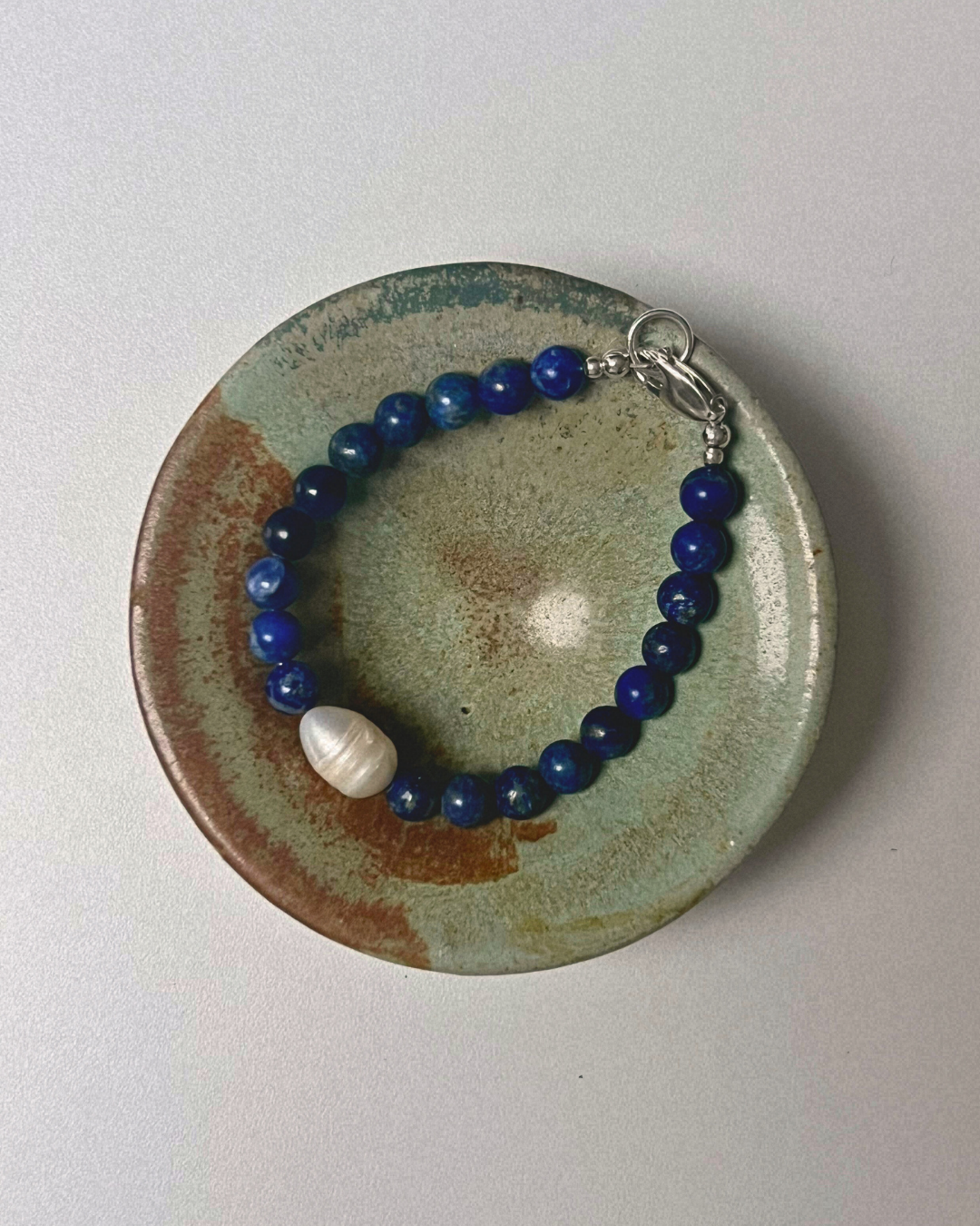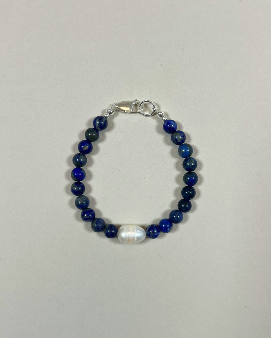 Lapis lazuli is known for its depth and intuitive clarity, often associated with insight and inner strength. The freshwater pearl adds softness and gentle reflection, creating a calm contrast to the rich blue of the stone. Together, they form a bracelet that feels composed, balanced, and quietly luminous.