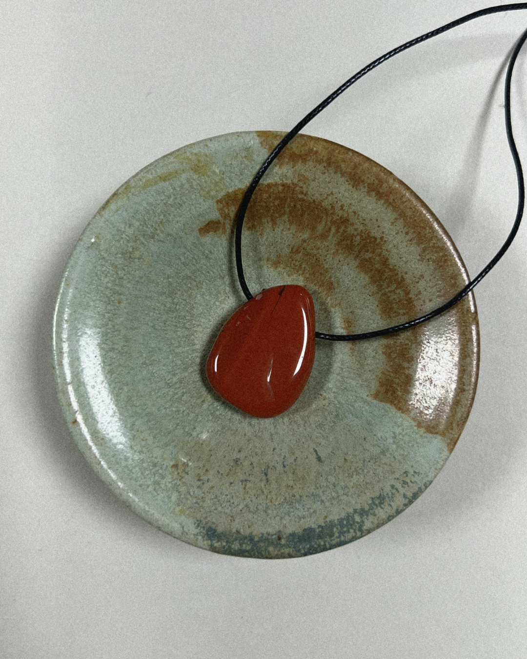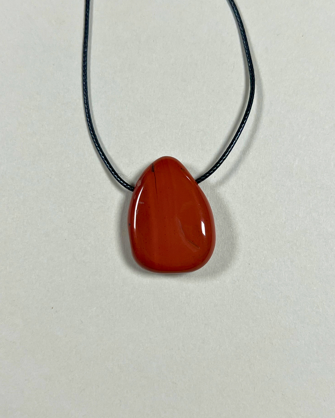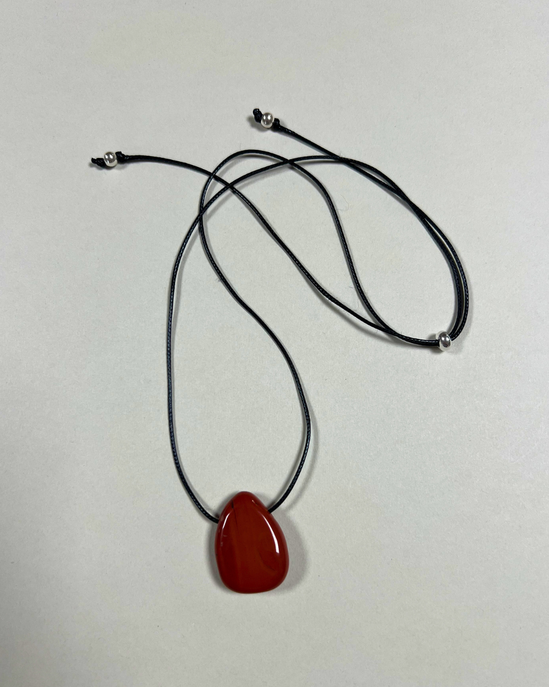 A statement yet timeless necklace featuring a smooth red jasper Forma pendant, suspended from a black cord and secured with a sterling silver slider bead and accent beads. Designed for versatility, it can be worn at any length, adjusting effortlessly from long and elegant to a closer fit.