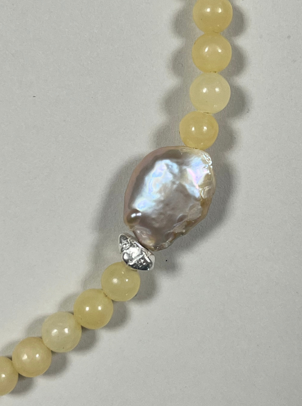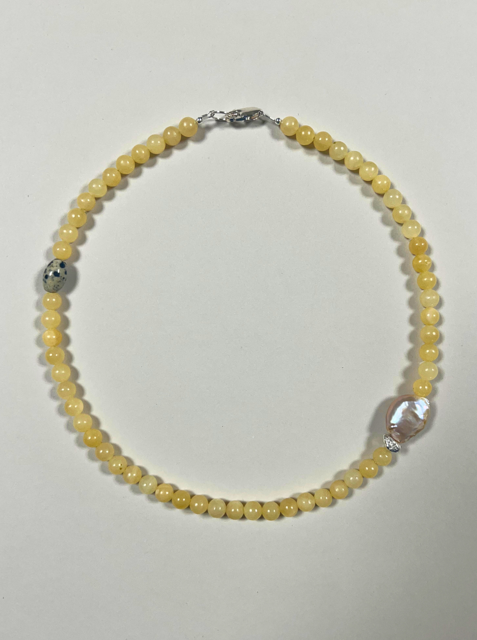 A limited, handmade piece featuring sunny yellow jade beads, hand-strung with a sterling silver clasp and findings. A large, irregular freshwater pearl sits alongside a textured sterling silver nugget and a dalmatian jasper accent bead.