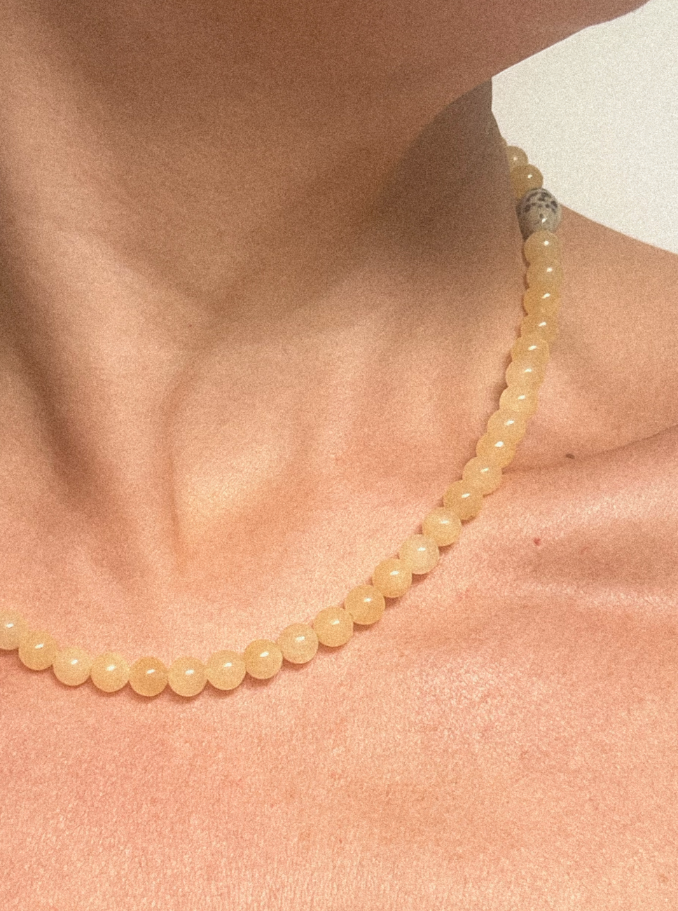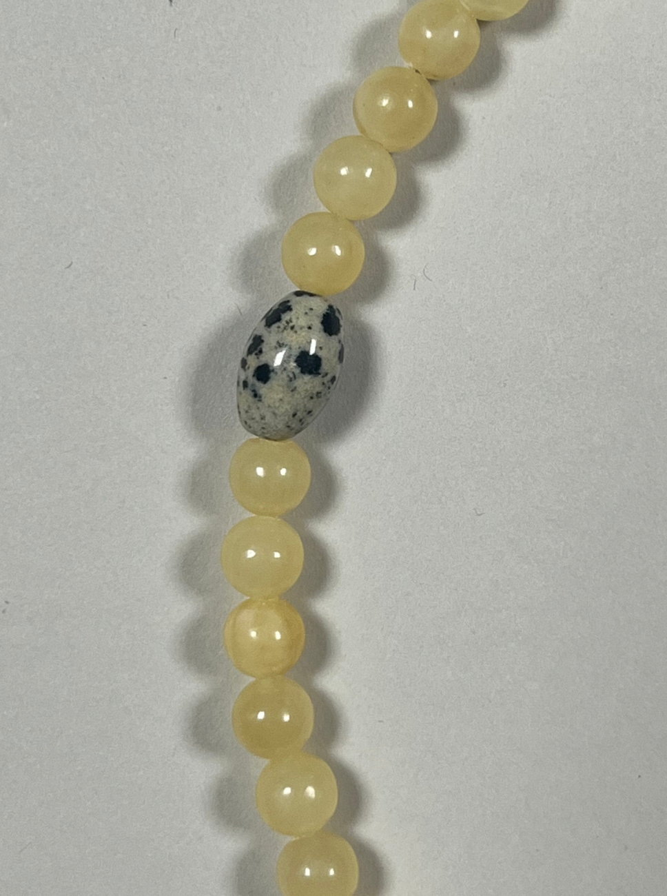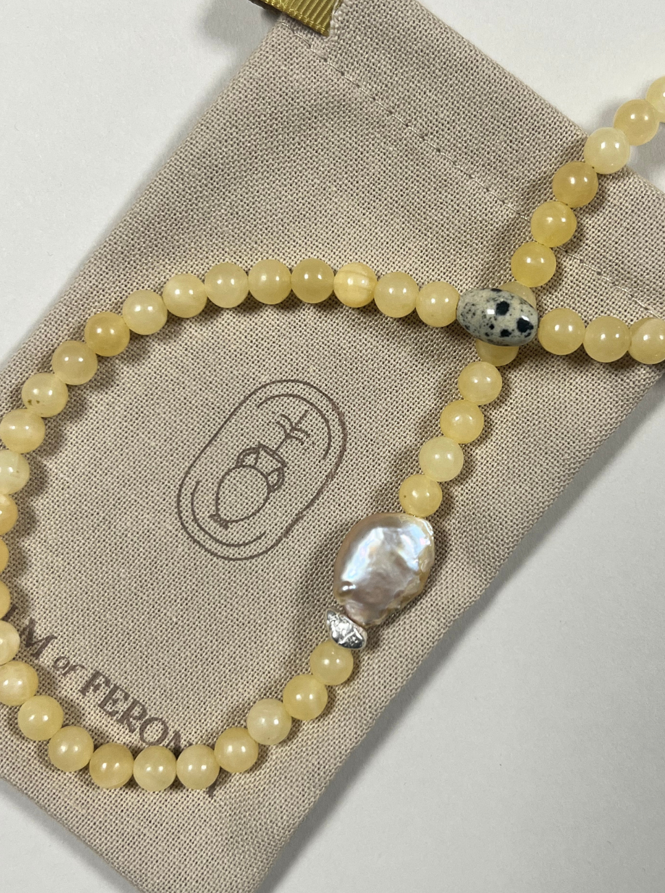 Yellow jade is associated with joy, vitality and emotional balance. Dalmatian jasper brings stability and a sense of lightness, while pearl adds calm, intuition and organic beauty. Together, these elements form a piece that feels optimistic, steady and softly radiant.