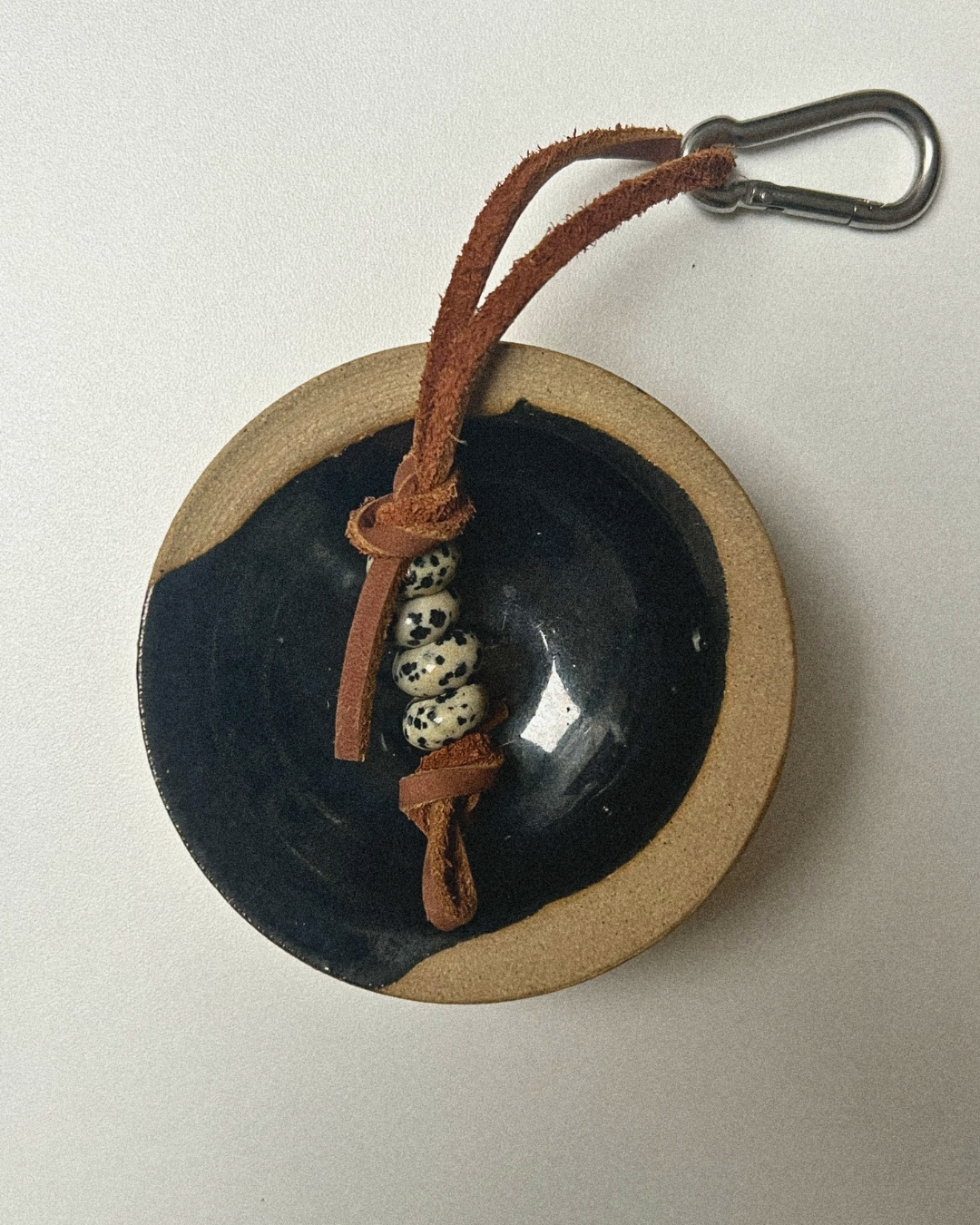 A knotted leather talisman - tactile and grounded, made to move with you. Each piece is hand-worked in soft brown leather, wrapped around a stack of four smooth gemstone beads and finished with a solid stainless steel carabiner.