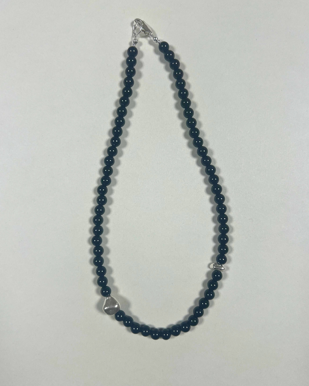 A one-of-a-kind necklace featuring 6mm onyx beads with two sterling silver irregular nugget accents. All findings and clasp are sterling silver.