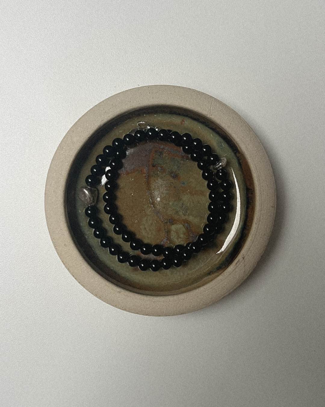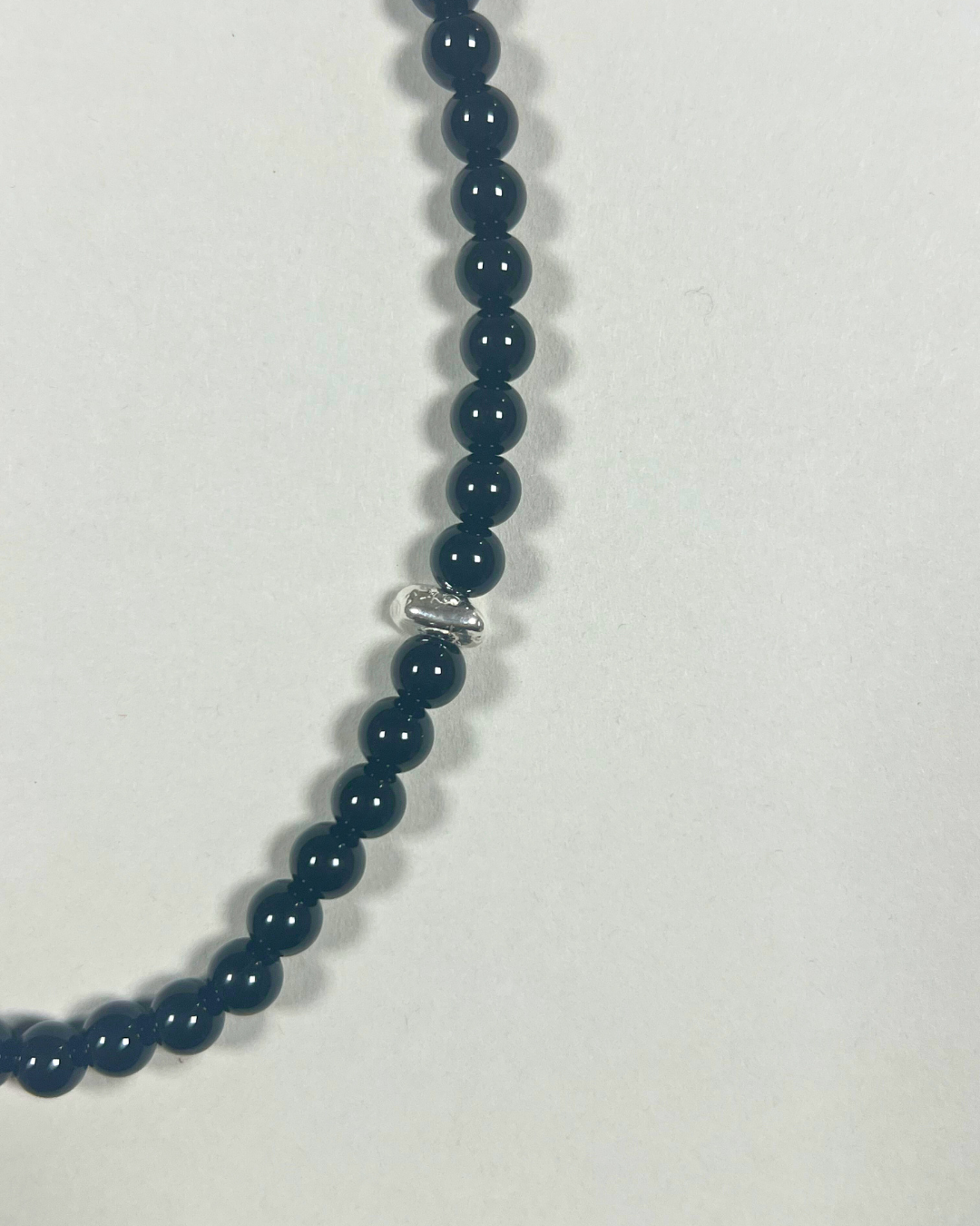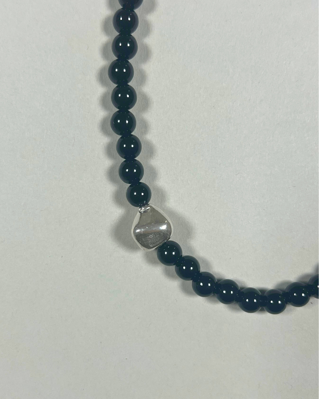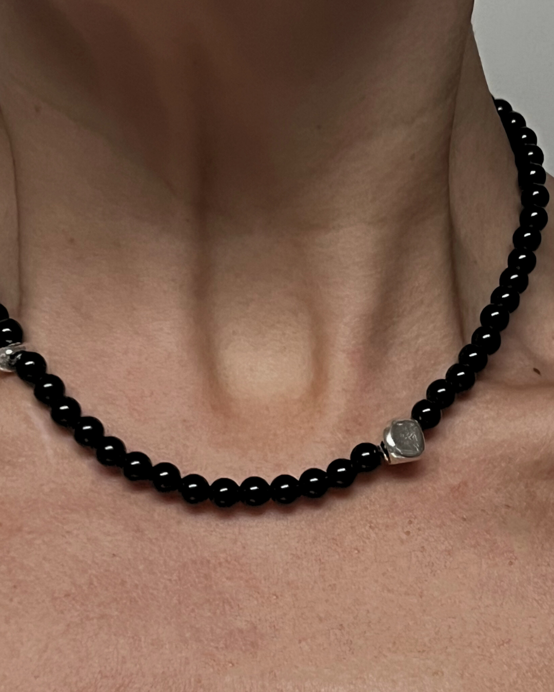 Onyx brings depth and composure with its smooth, polished black tone, while the silver nuggets introduce light and texture, creating a subtle, modern contrast. The simplicity of the form lets the materials speak - grounded, refined, and quietly assured.