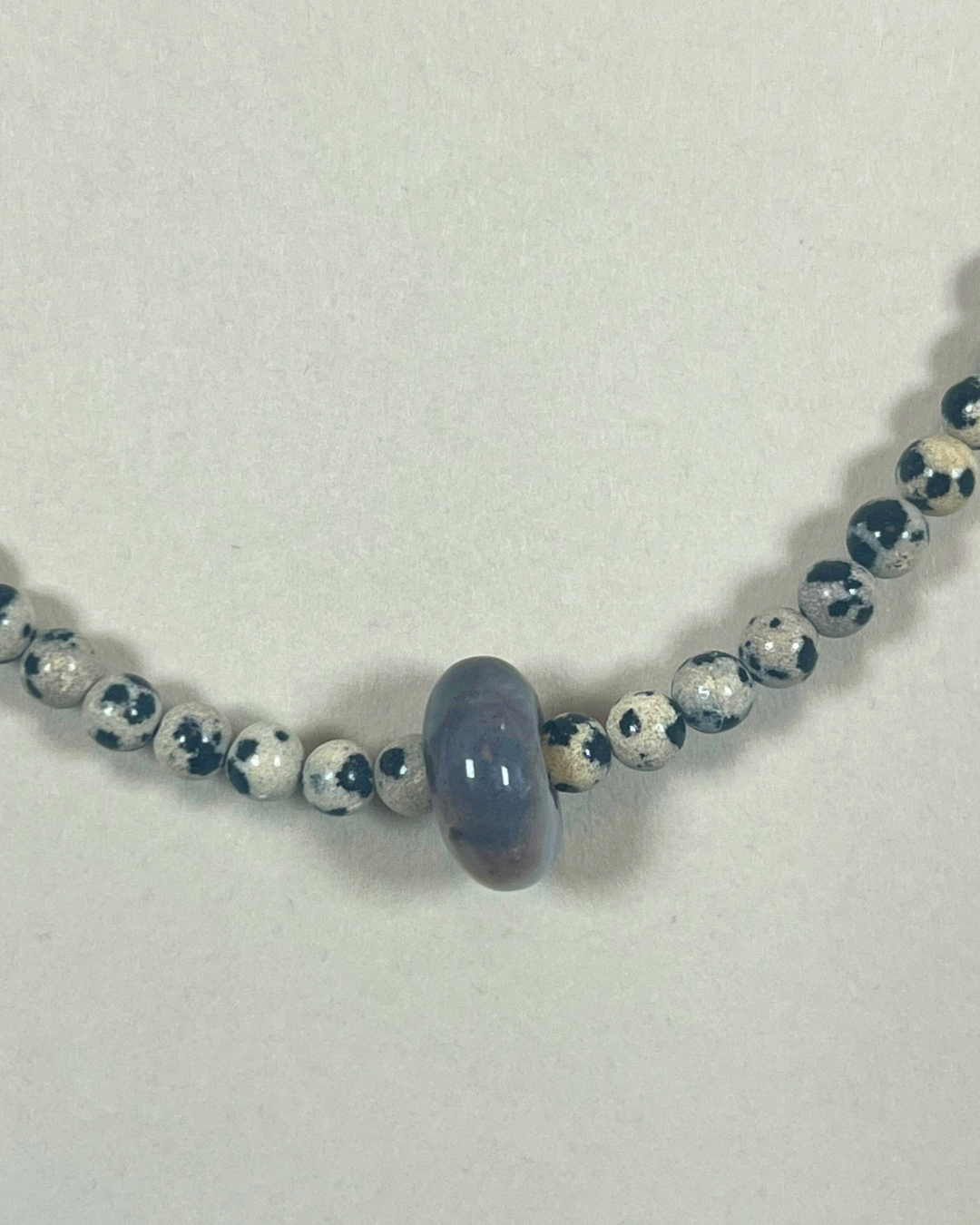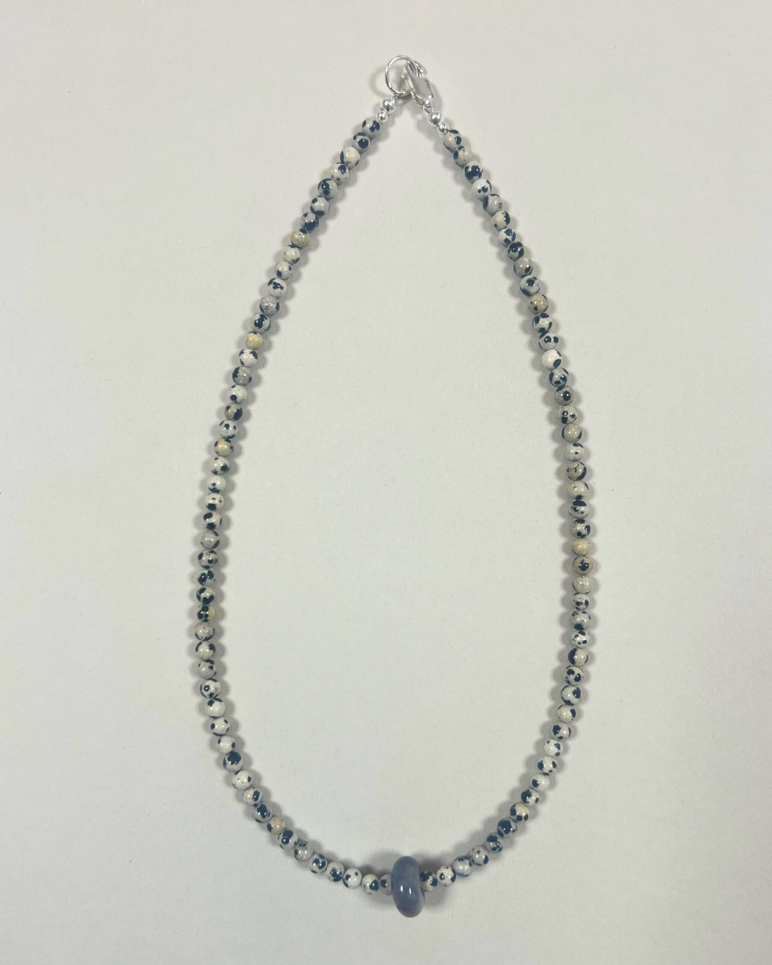 A one-of-a-kind movement necklace featuring 4 mm dalmatian jasper beads with a moveable ocean jasper bead. All findings and clasp are sterling silver.