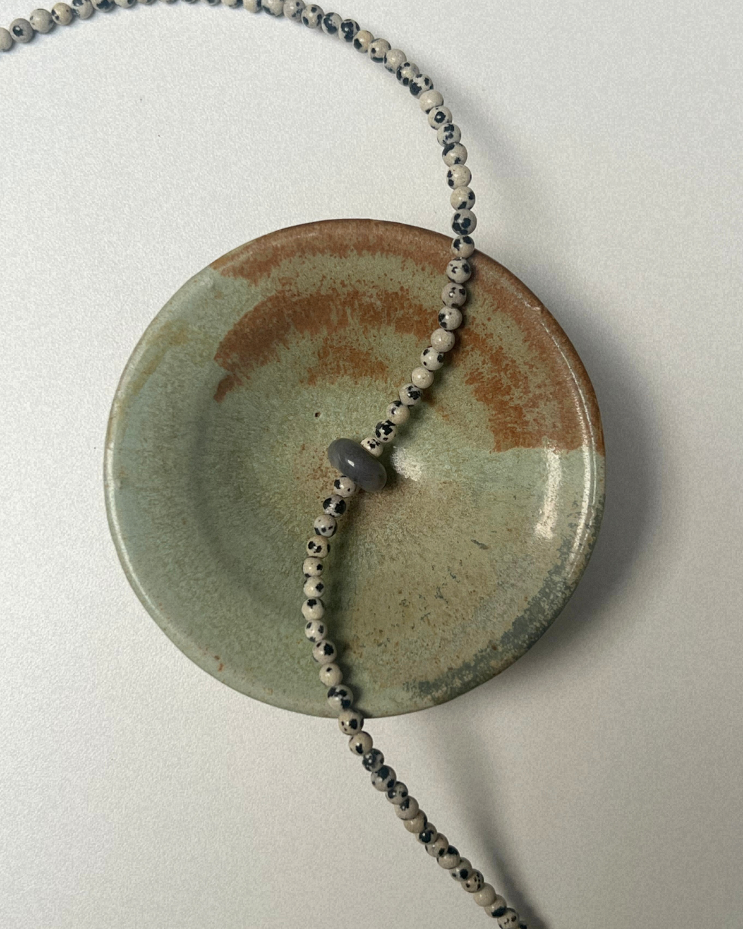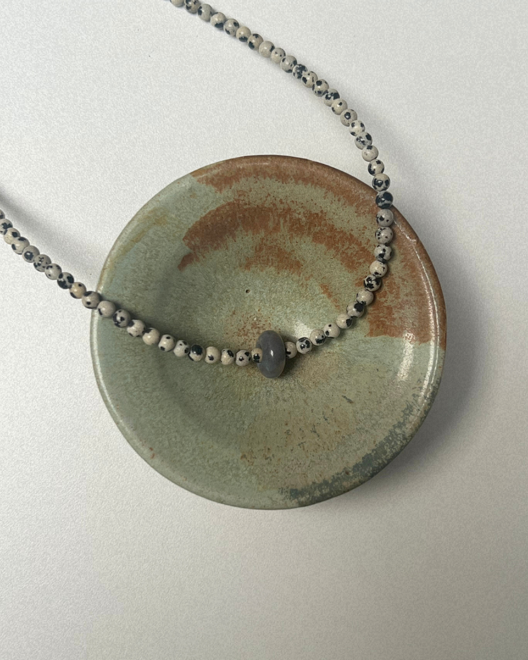 Dalmatian jasper brings grounding balance and gentle contrast through its natural patterning, while ocean jasper adds softness and organic variation. The moveable element invites touch and quiet movement, creating a piece that feels calm, tactile, and reassuringly held.