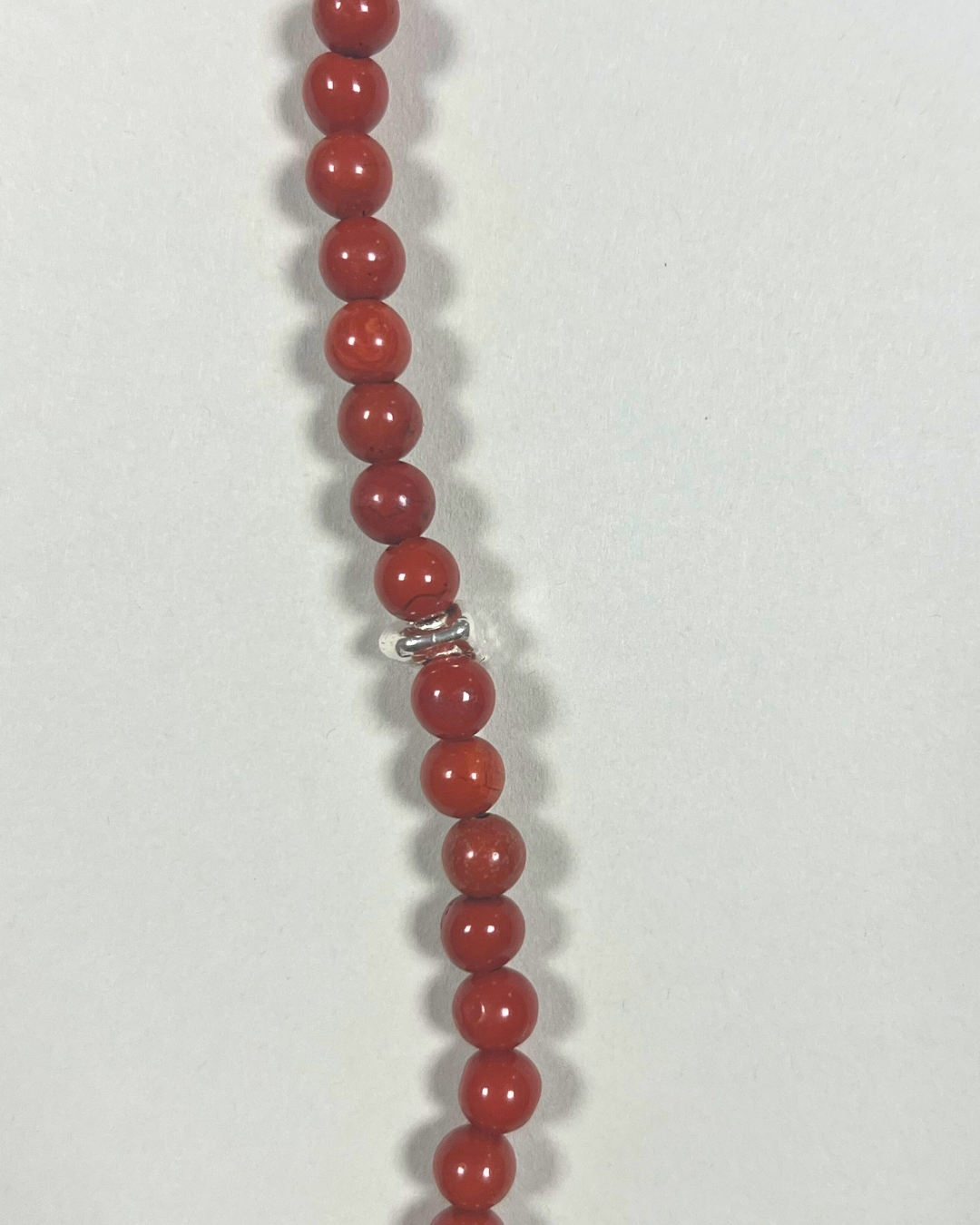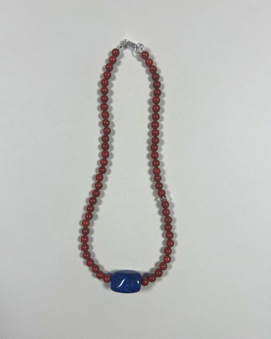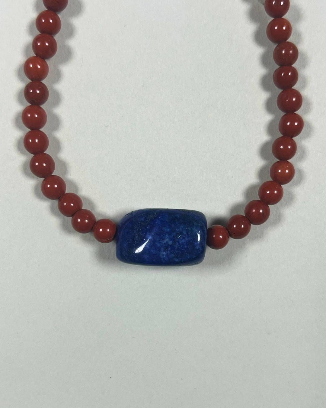 A one-of-a-kind necklace featuring 6mm red jasper beads with a central large lapis lazuli and an accent sterling silver nugget bead. All findings and clasp are sterling silver.