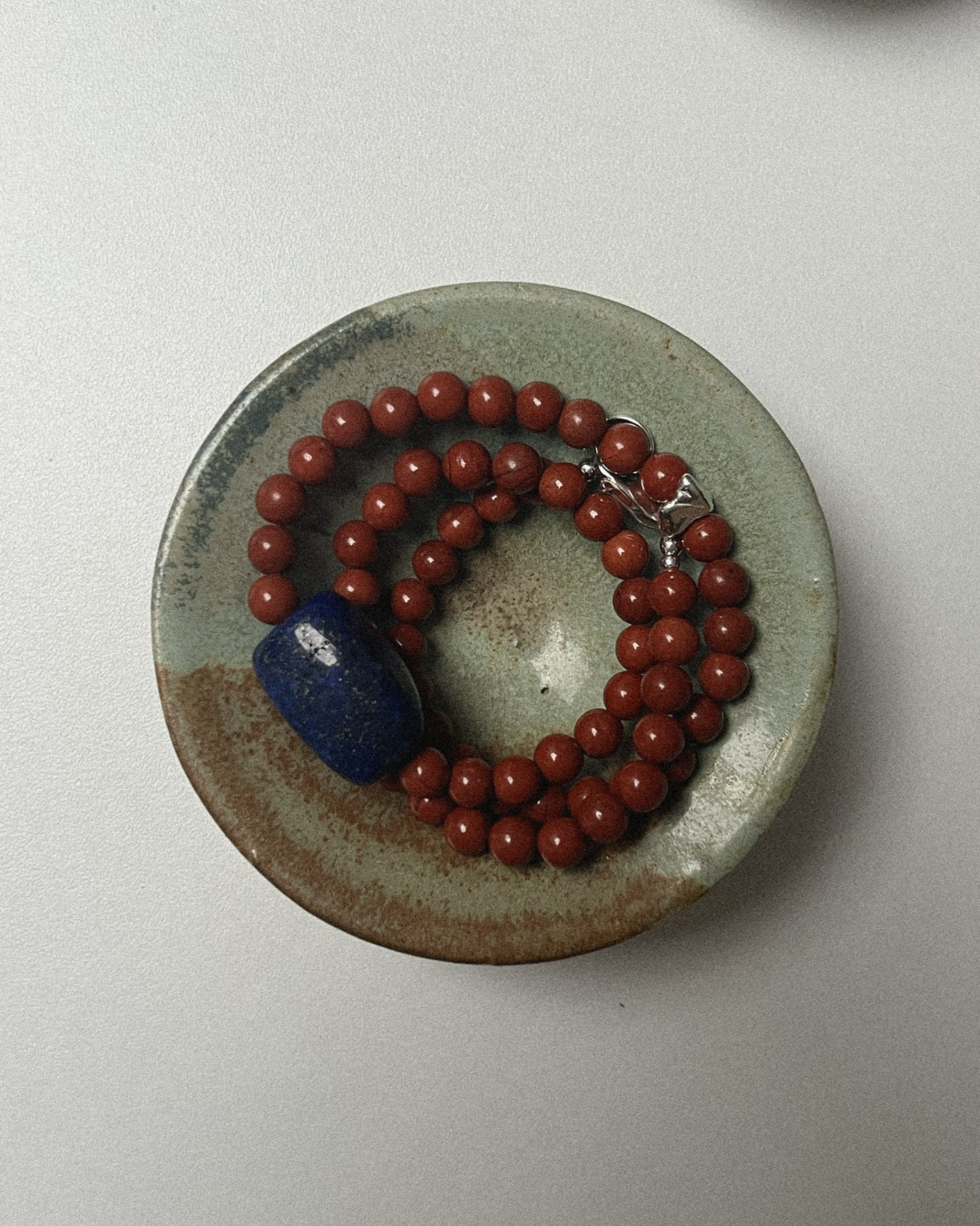 Red jasper offers an earthy steadiness with its warm, grounded tone, while lapis lazuli brings depth and clarity through its rich blue surface and natural gold flecks. The sterling silver nugget adds a subtle touch of texture and light, balancing the composition with quiet contrast. Together, they create a piece that feels strong, centred, and thoughtfully refined.