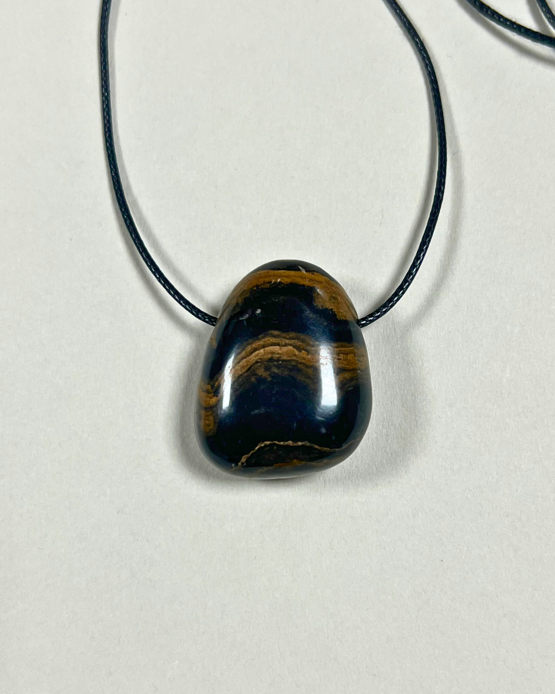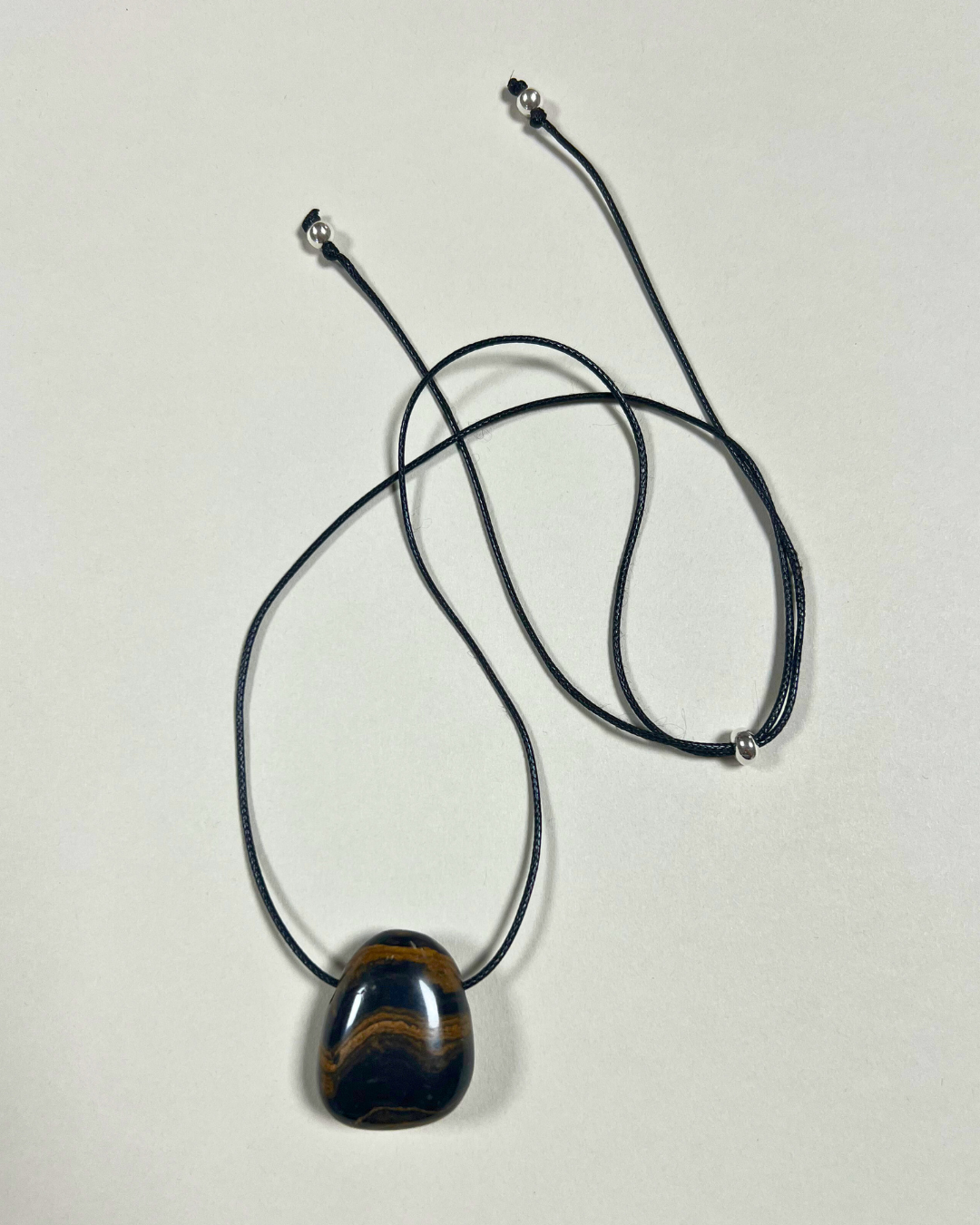 A statement necklace featuring a smooth stromatolite Forma pendant, suspended from a black cord and secured with a sterling silver slider bead and accent beads. Designed for versatility, it can be worn at any length, adjusting effortlessly from long and elegant to a closer fit.