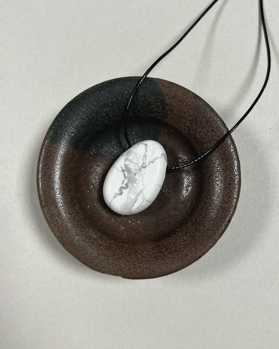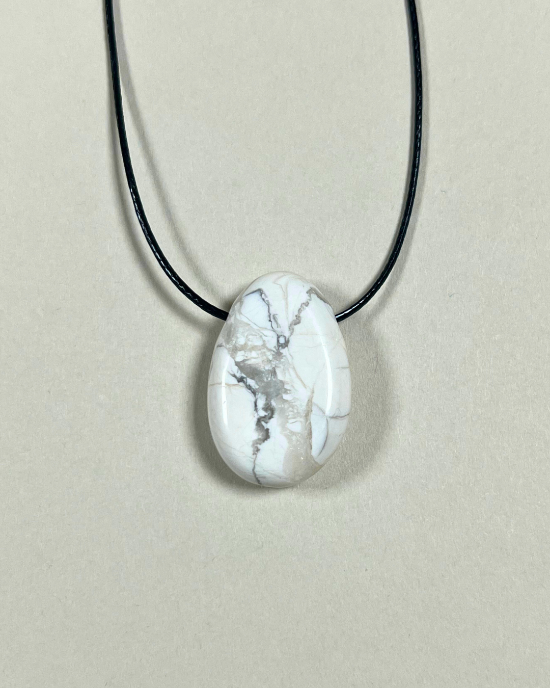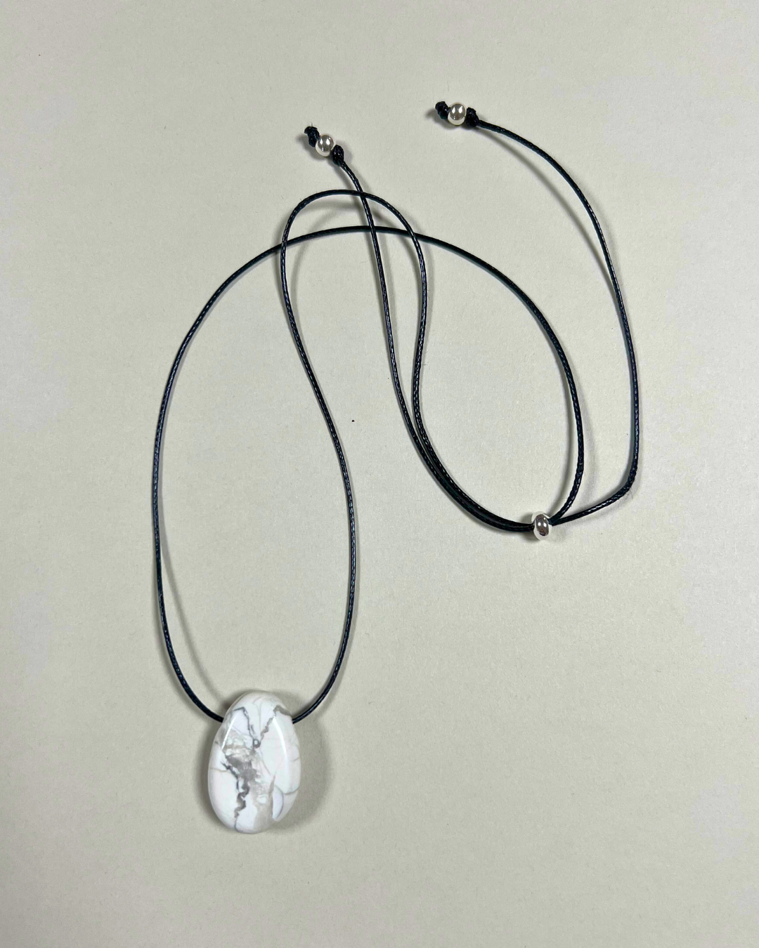 A statement necklace featuring a smooth howlite Forma pendant, suspended from a black cord and secured with a sterling silver slider bead and accent beads. Designed for versatility, it can be worn at any length, adjusting effortlessly from long and elegant to a closer fit.