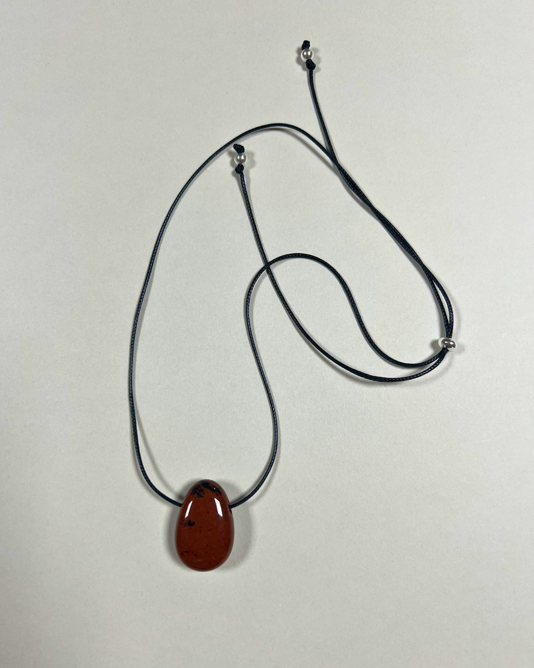 A statement necklace featuring a smooth mahogany obsidian Forma pendant, suspended from a black cord and secured with a sterling silver slider bead and accent beads. Designed for versatility, it can be worn at any length, adjusting effortlessly from long and elegant to a closer fit.