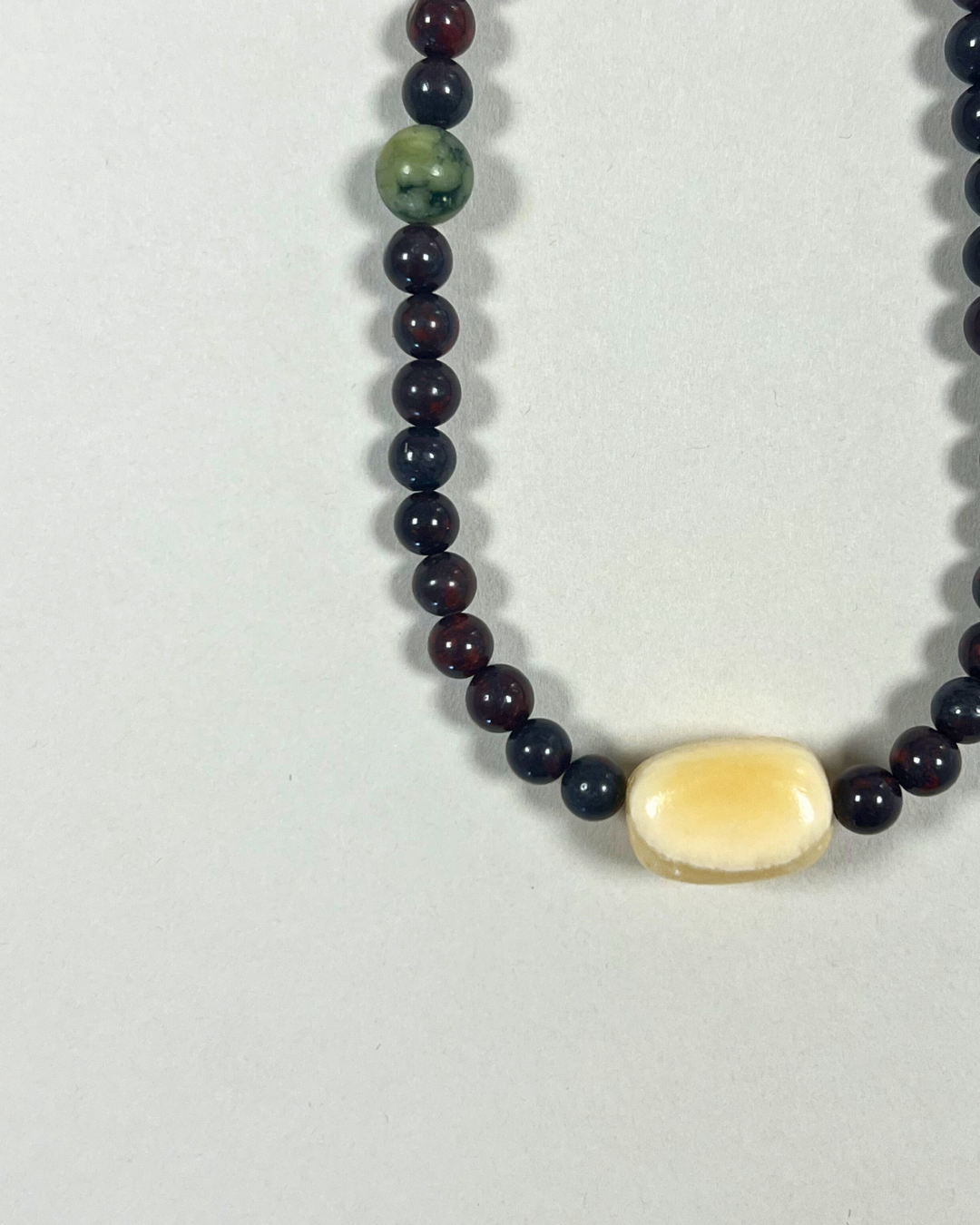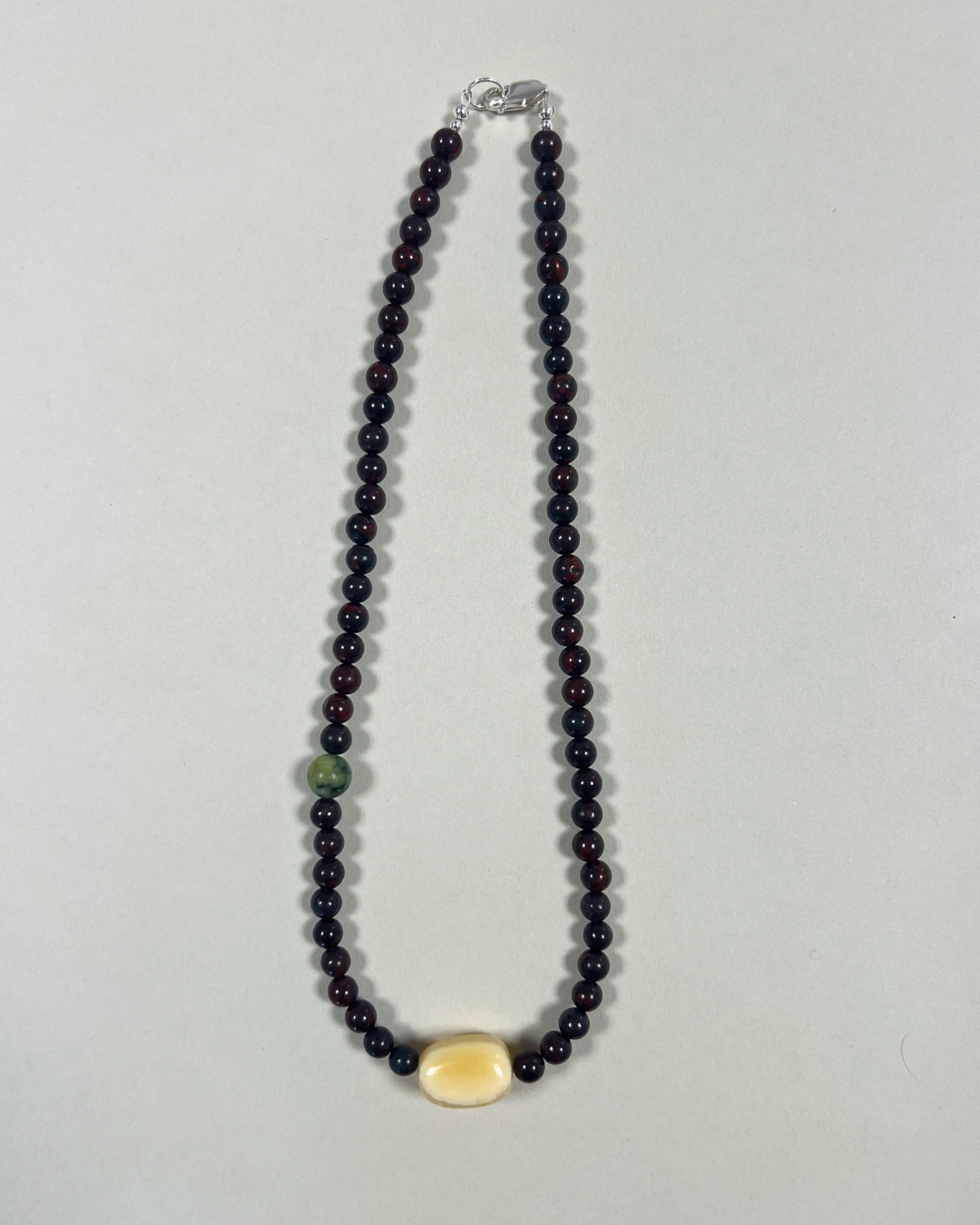 A one of a kind necklace featuring 6mm deep red bloodstone beads, centred with a smooth yellow calcite stone and accented with green jade. Hand-strung and finished with sterling silver findings and clasp.