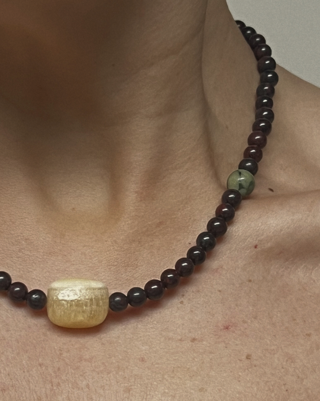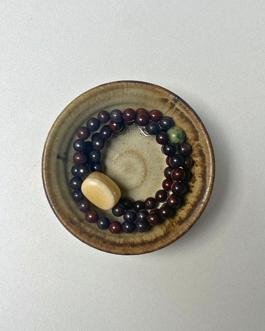 Bloodstone is often associated with resilience and steady focus, traditionally linked to courage and grounding. Yellow calcite brings brightness and clarity, while green jade is connected to balance and harmony. Together, the tones feel rich and considered, with a subtle contrast between depth and lightness.