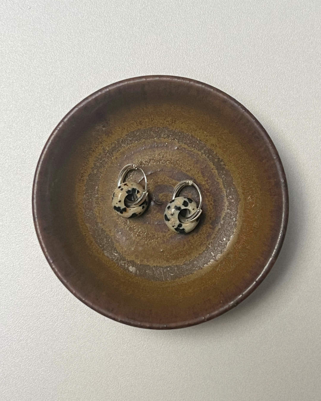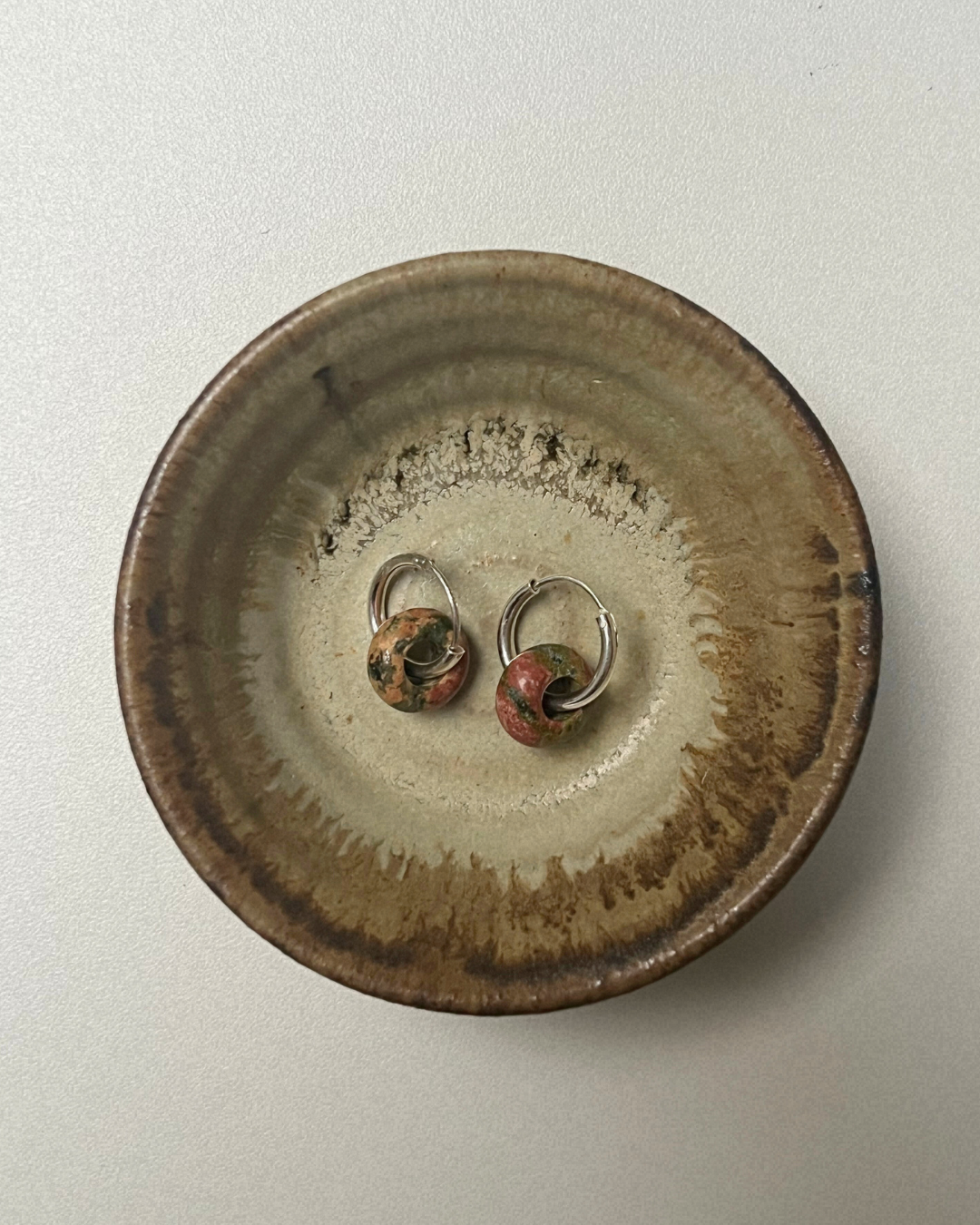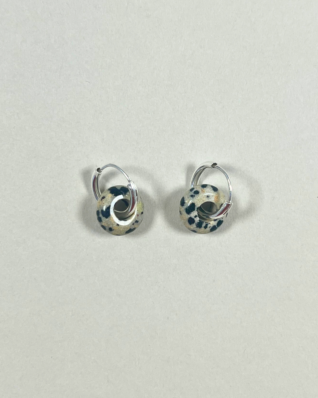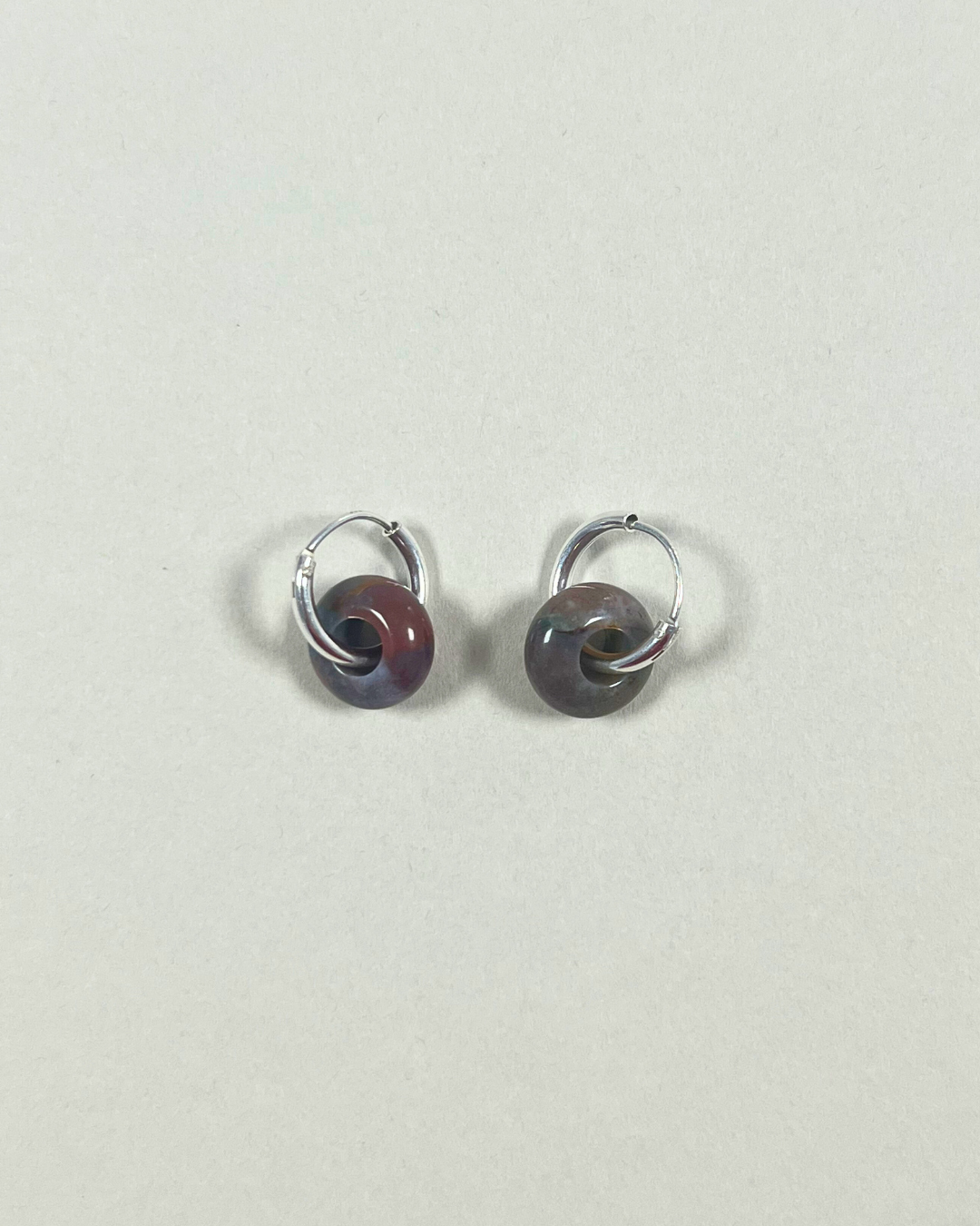 A pair of 14 mm sterling silver sleeper hoop earrings, looped through a smooth gemstone disc that moves freely on the hoop. Designed for everyday wear, the stone can be gently turned between the fingers, inviting touch and quiet interaction.