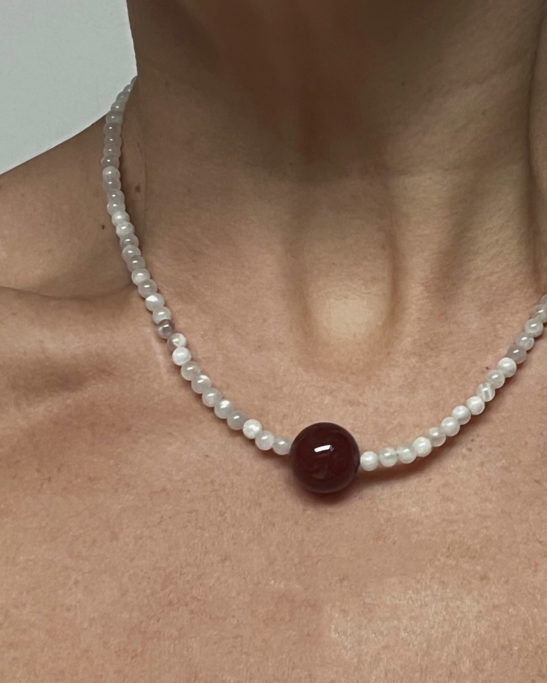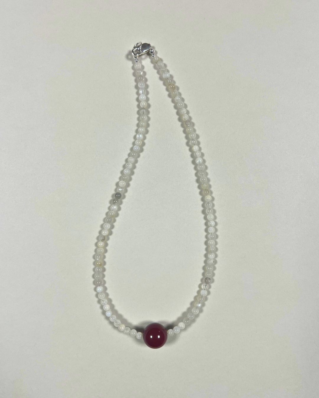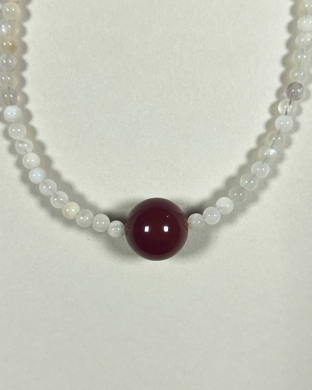 A one-of-a-kind necklace featuring petite 4 mm moonstone beads with a central smooth round deep red carnelian. All findings and clasp are sterling silver.