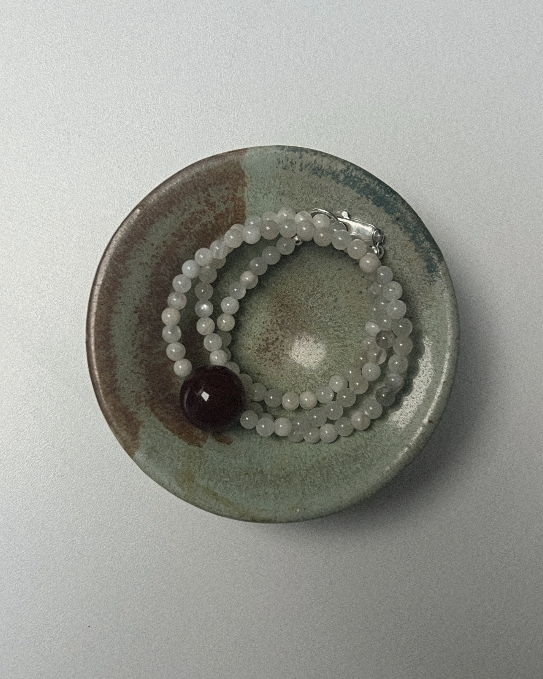 Moonstone is often connected with intuition and gentle clarity, offering a soft, luminous openness. Carnelian brings warmth and quiet vitality, known for its grounding, steady energy and rich red tone. Together, they create a piece that feels balanced, warm, and subtly energising while still calm at its core.