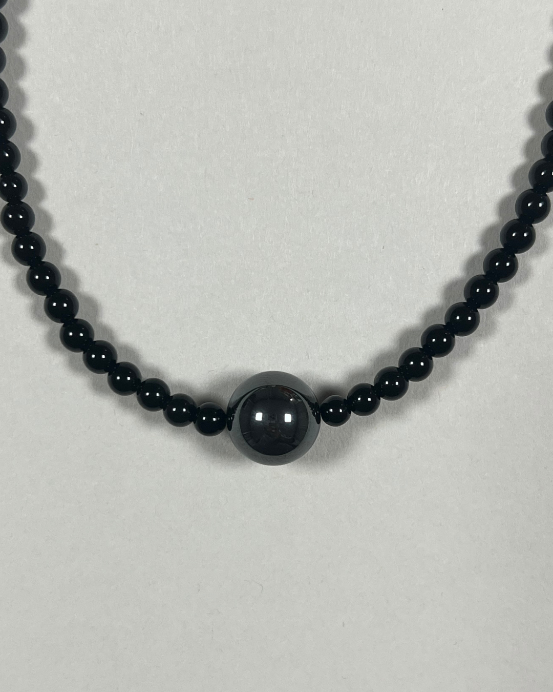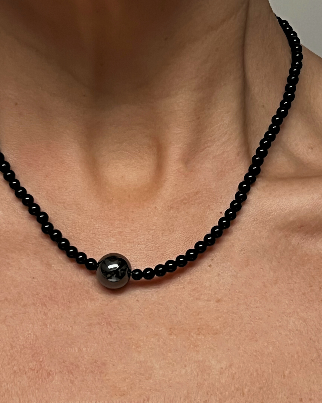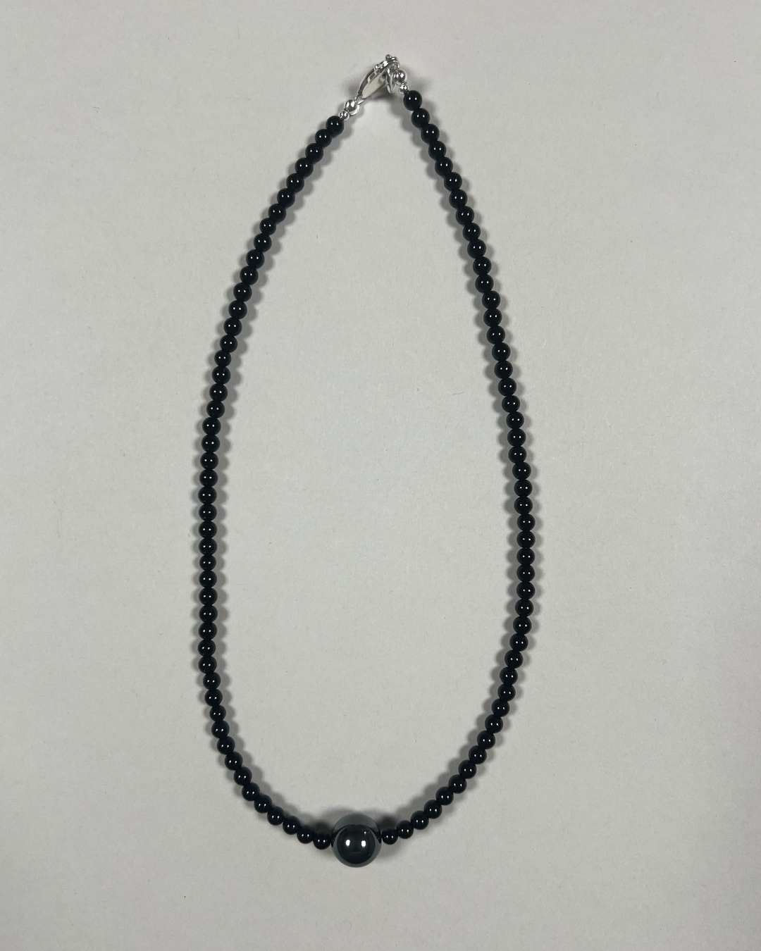 A one-of-a-kind necklace featuring petite 4 mm onyx beads with a central smooth hematite sphere. All findings and clasp are sterling silver.