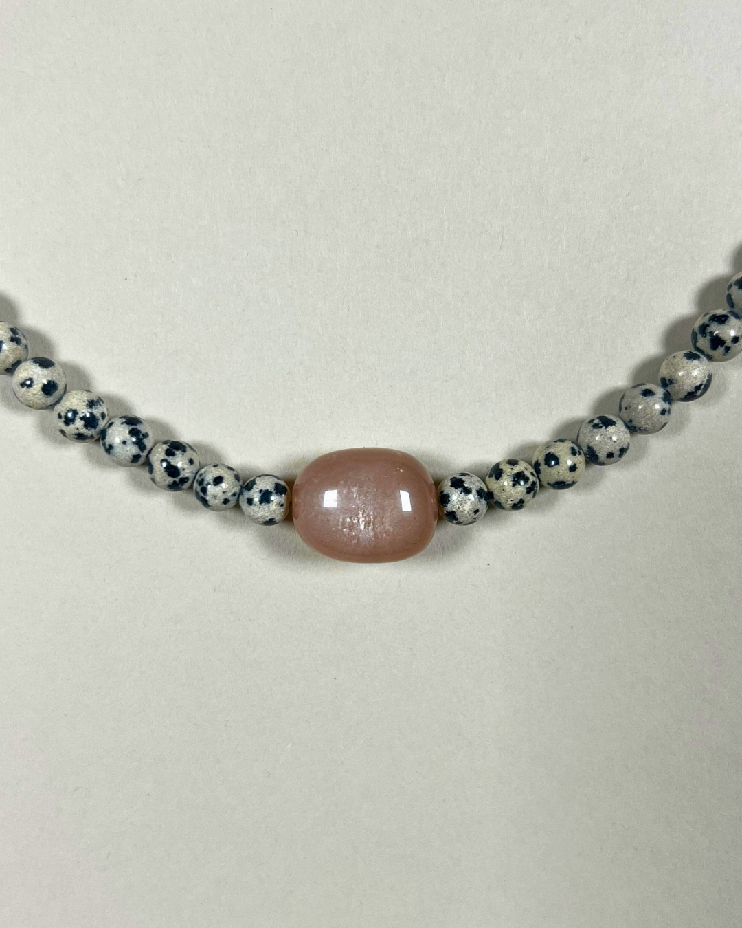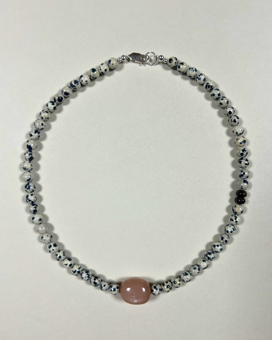 A one-of-a-kind necklace featuring 6mm dalmatian jasper beads with a smooth, iridescent peach moonstone at the centre and an accent stack of bronzite rondelles. All findings and clasp are sterling silver.