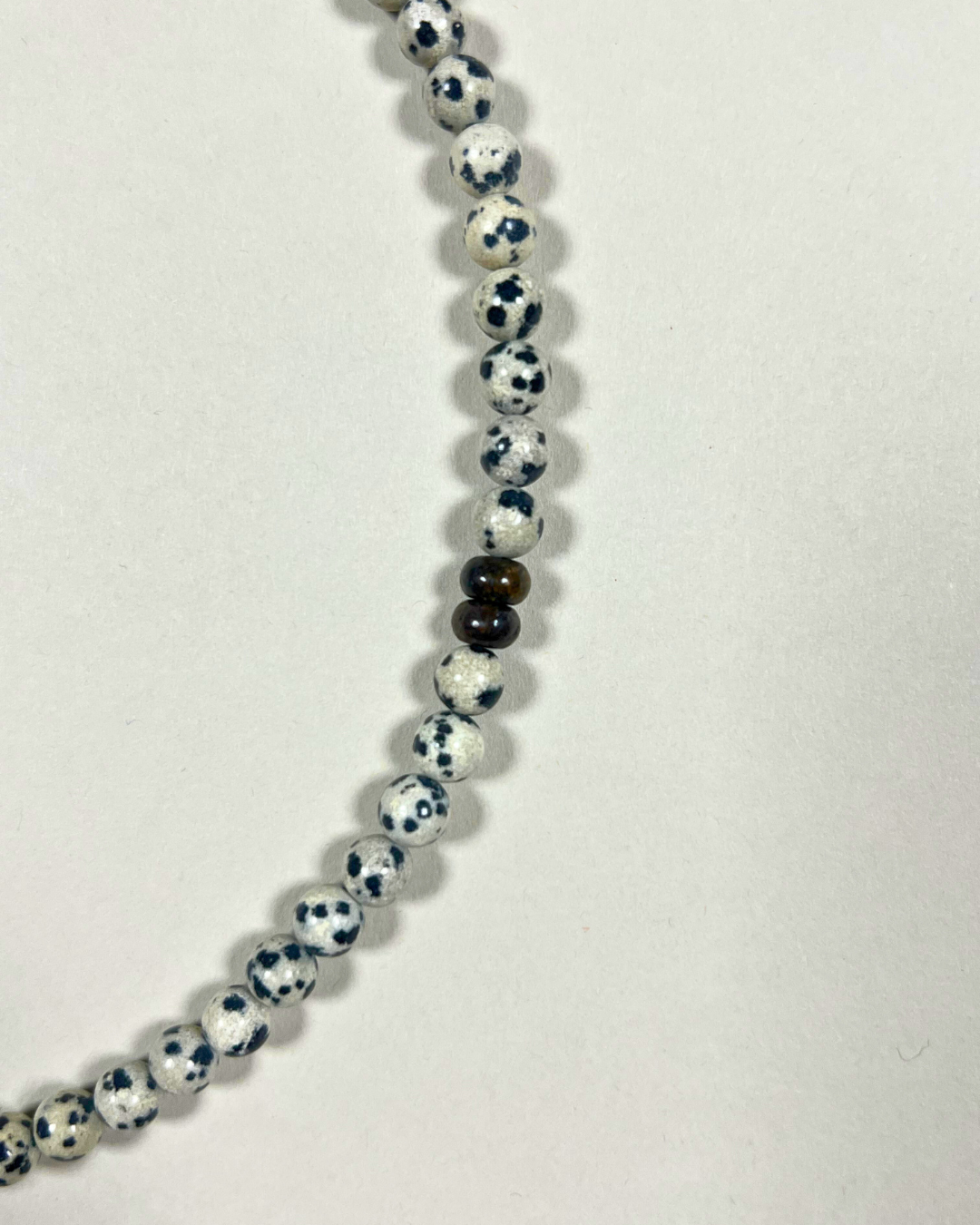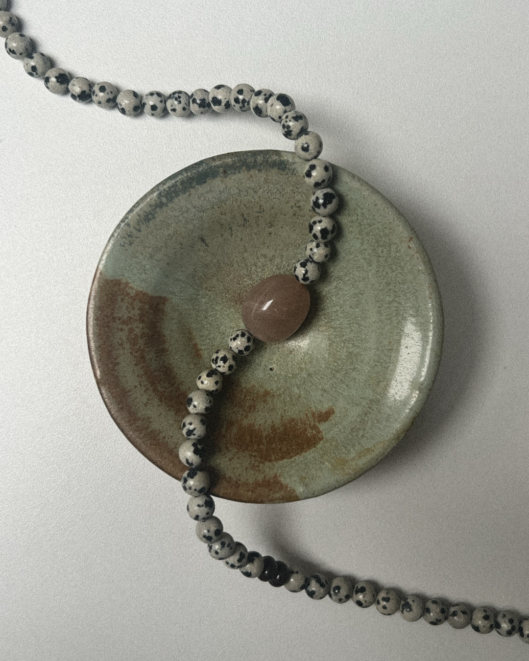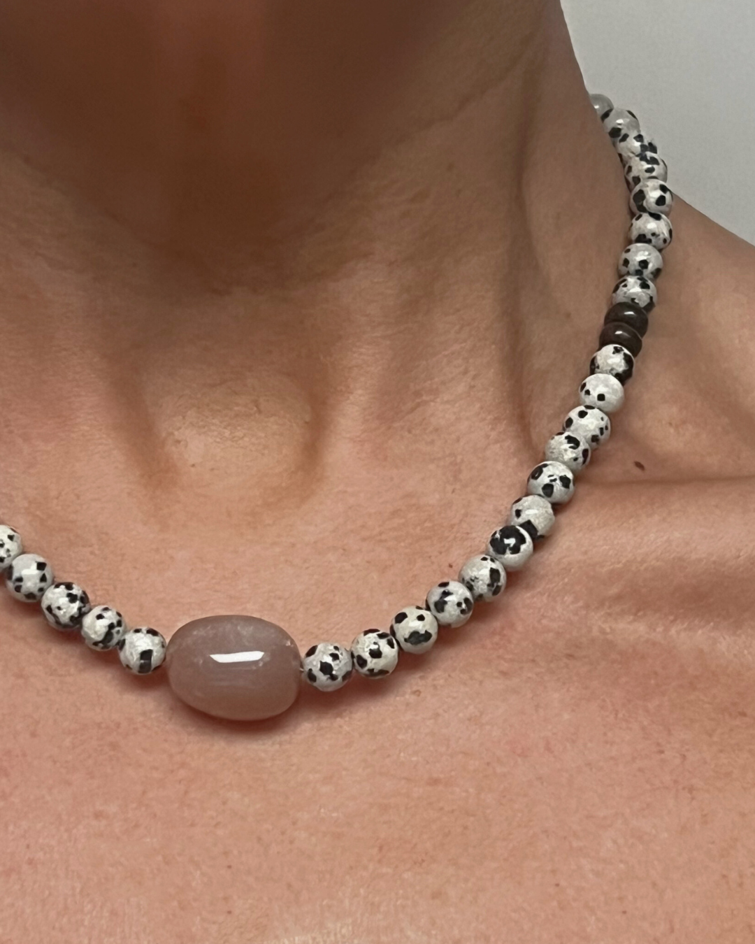 Dalmatian jasper is playful yet grounding, known to balance light-hearted energy with stability and calm. Moonstone brings softness and intuition, its gentle shimmer evoking inner reflection, while bronzite adds steadiness and protection. Together, they create a piece that feels harmonious, grounding, and quietly luminous.